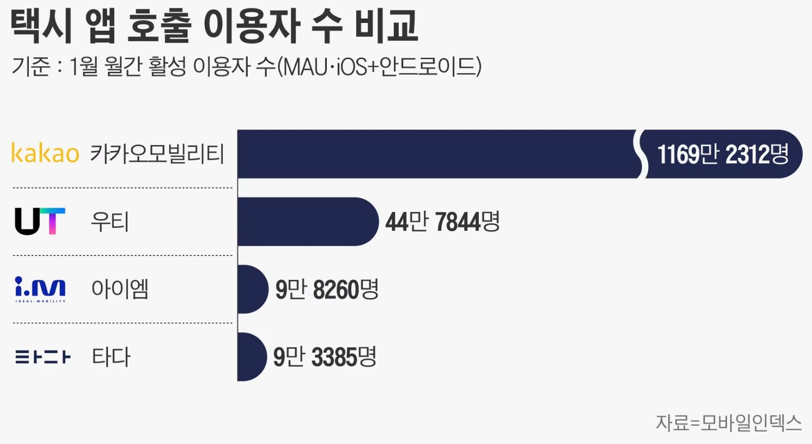 아직 국내에서는 카카오 모빌리티의 택시 앱 호출 이용자수가 압도적이지만